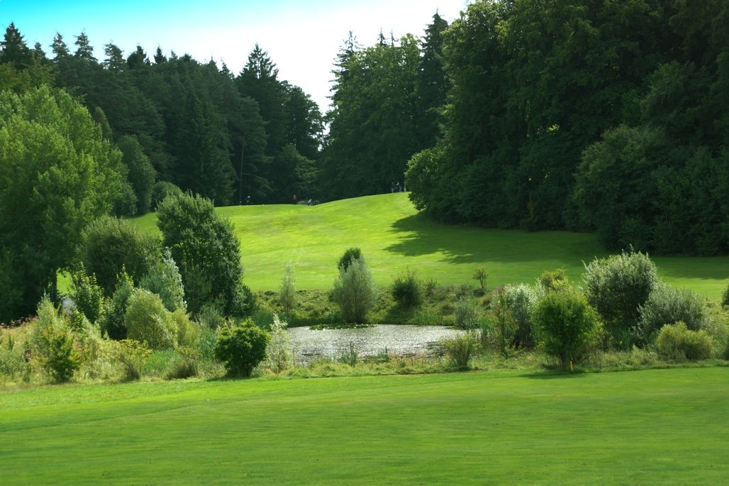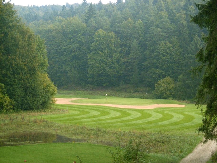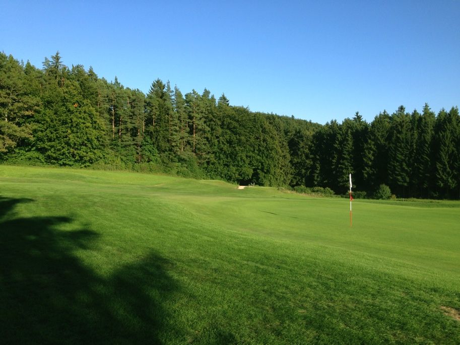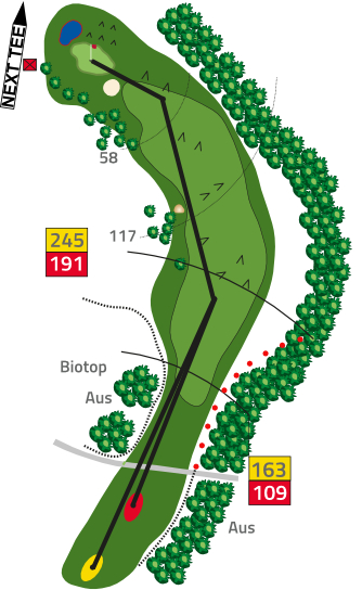 Ein mit 457 Metern für Herren und 385 Metern für Damen relativ kurzes PAR 5, das sich durch das Tal "In der Engelmeß" entlang streckt. Das Grün kann man mit drei Schlägen leicht erreichen. Man sollte auf dem Fairway bleiben, um den rechts und links sowie vor dem Grün rechts liegenden, flachen Bunker zu passieren. Eine Ausgrenze befindet sich links entlang der gesamten Spielbahn! Das links hinter dem Grün liegende Wasserhindernis sollte nach Möglichkeit nicht ins Spiel kommen. Zwei Netto-Punkte sind hier ohne Probleme zu holen.