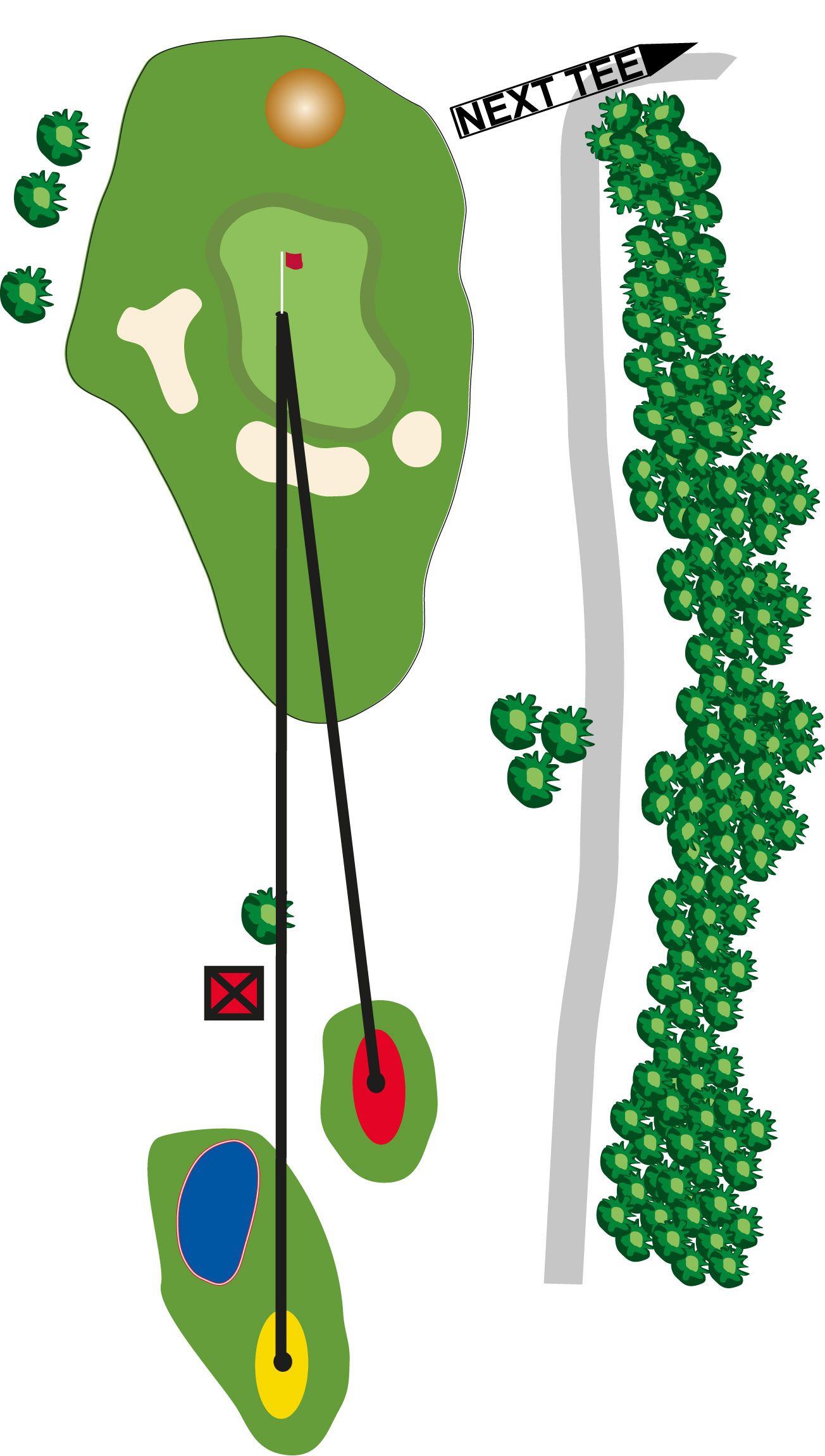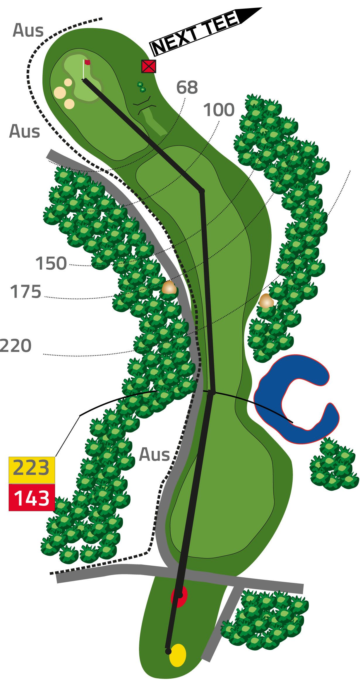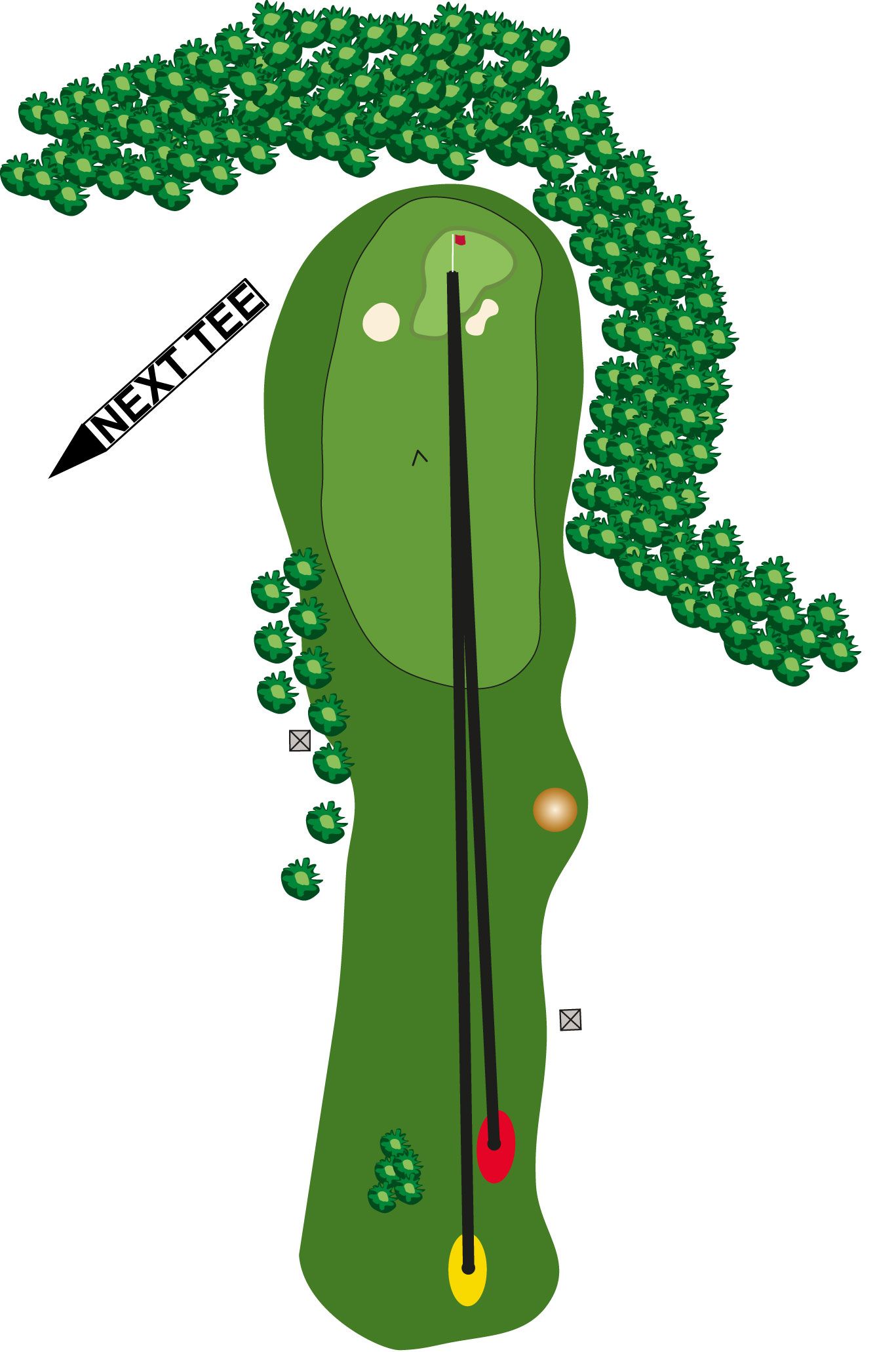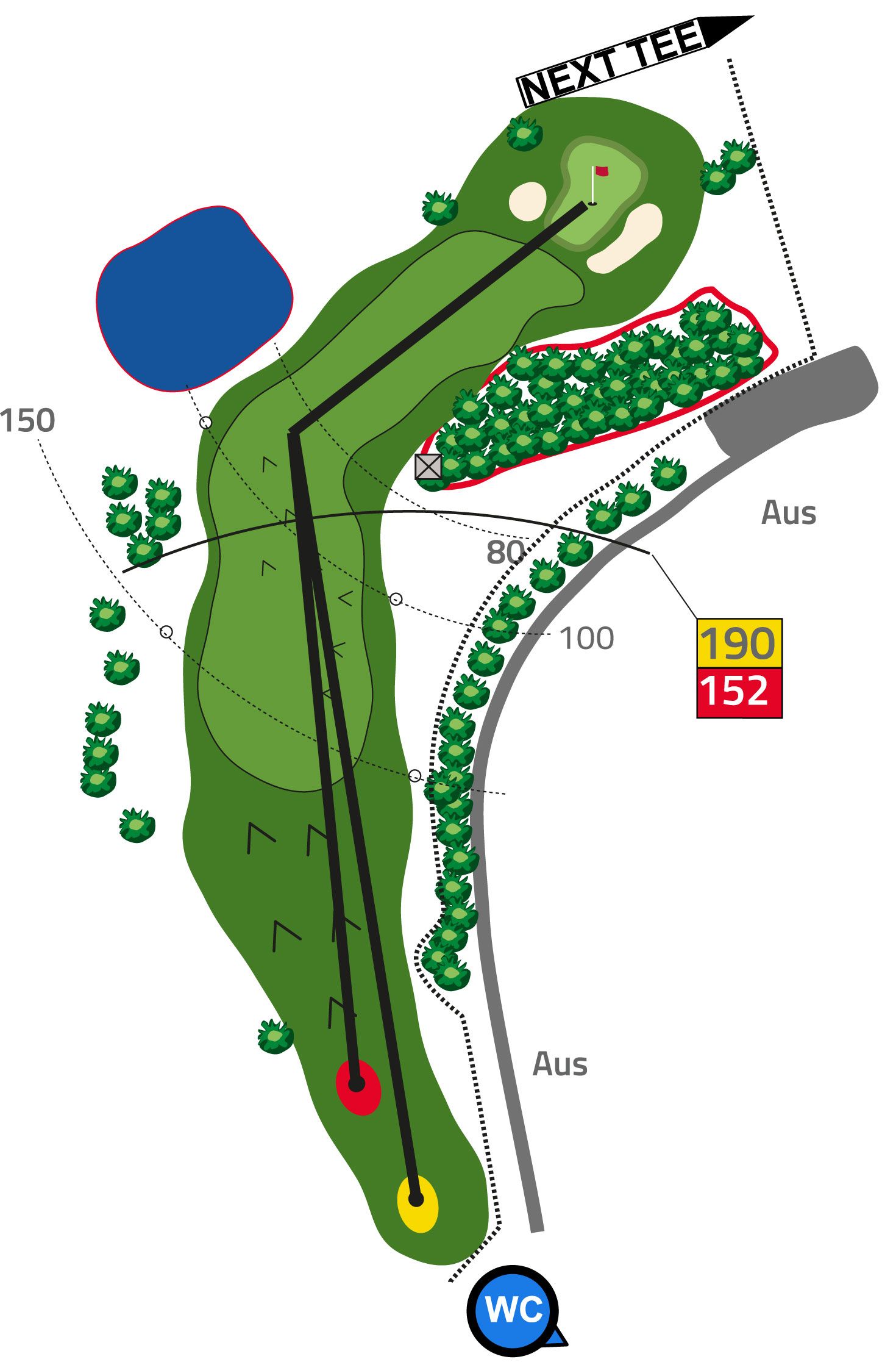 Ein Tricky-Loch mit scharfem Dogleg nach links. Der Abschlag sollte 140 bis 150 Meter "carry" an der linken Ausgrenze vorbeigehen, da sich ein nicht einsehbarer Bunker vor dem Fairway befindet. Das Grün ist verhältnismäßig schmal angelegt mit einer starken Neigung nach rechts. 2 Präzise Schläge vom Abschlag bis in's Grün sind erforderlich. Ein Wasserhindernis befindet sich vor dem Grün.