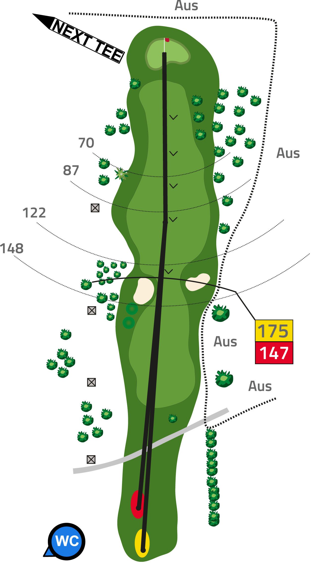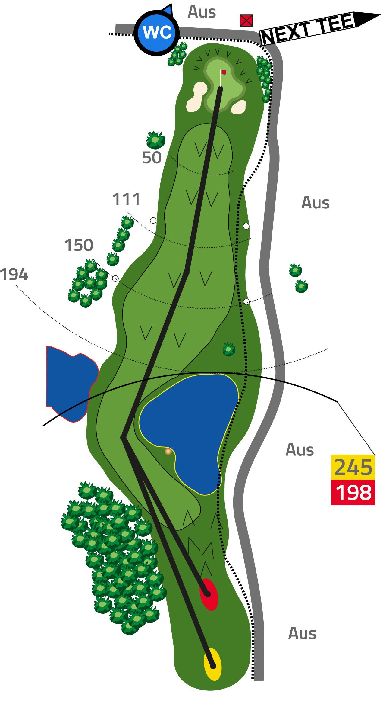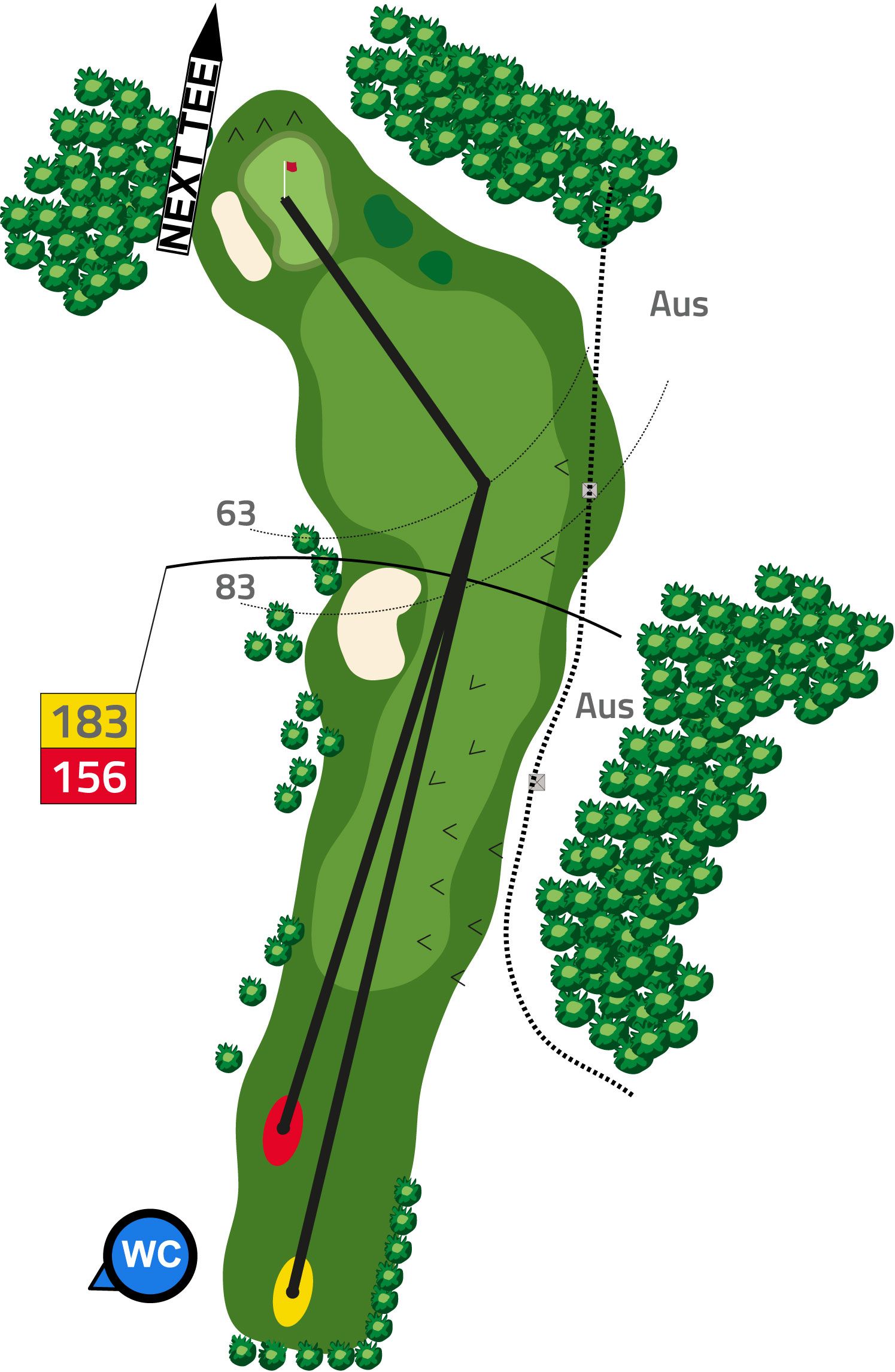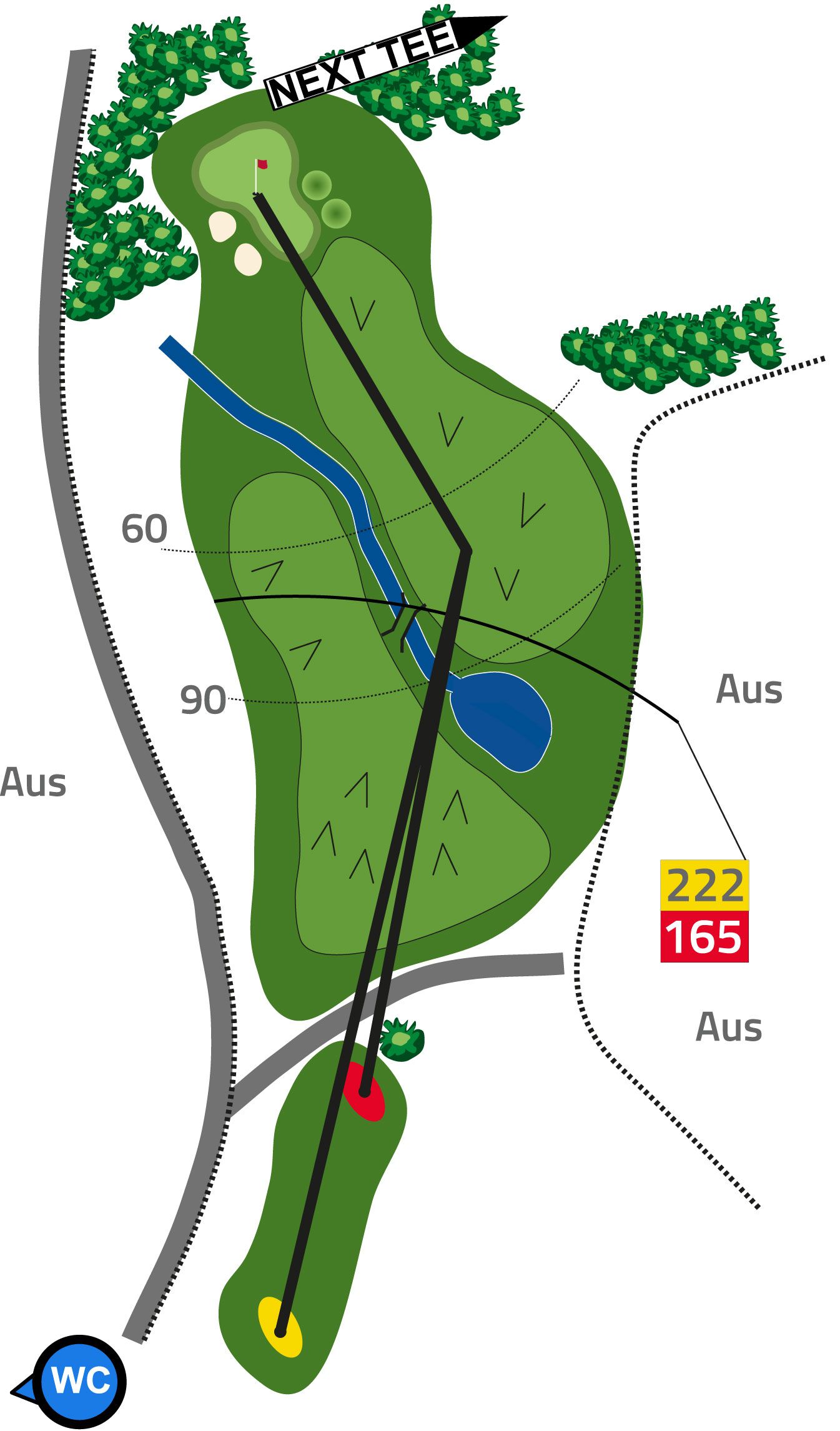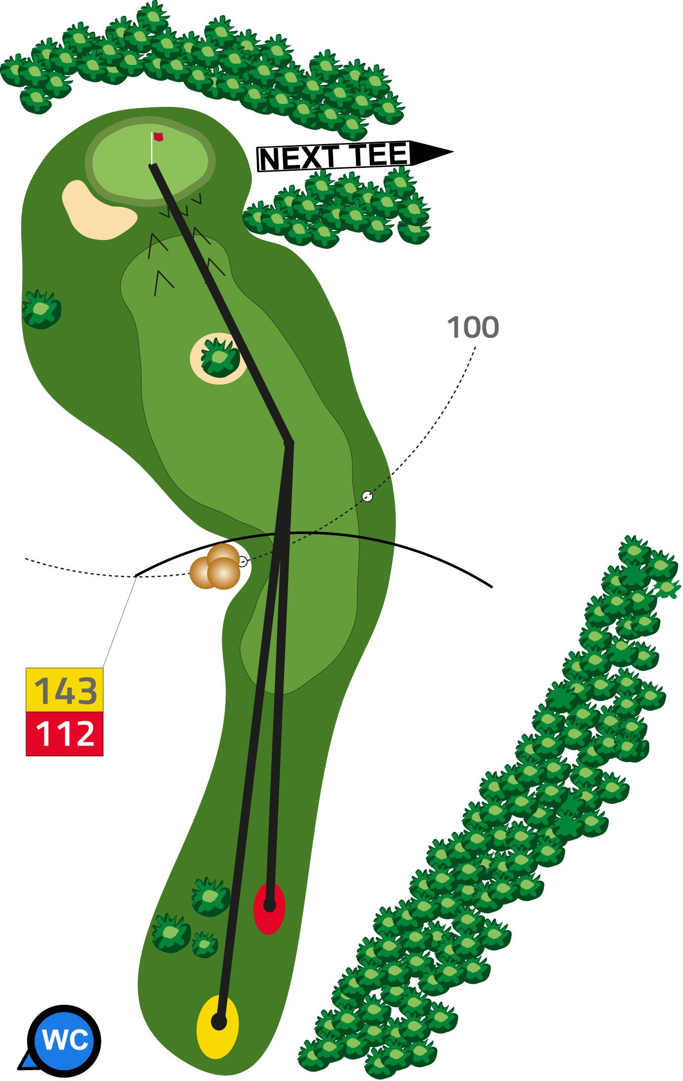 Ein Tricky-Loch mit scharfem Dogleg nach links. Der Abschlag sollte 140 bis 150 Meter "carry" an der linken Ausgrenze vorbeigehen, da sich ein nicht einsehbarer Bunker vor dem Fairway befindet. Das Grün ist verhältnismäßig schmal angelegt mit einer starken Neigung nach rechts. 2 Präzise Schläge vom Abschlag bis in's Grün sind erforderlich. Ein Wasserhindernis befindet sich vor dem Grün.