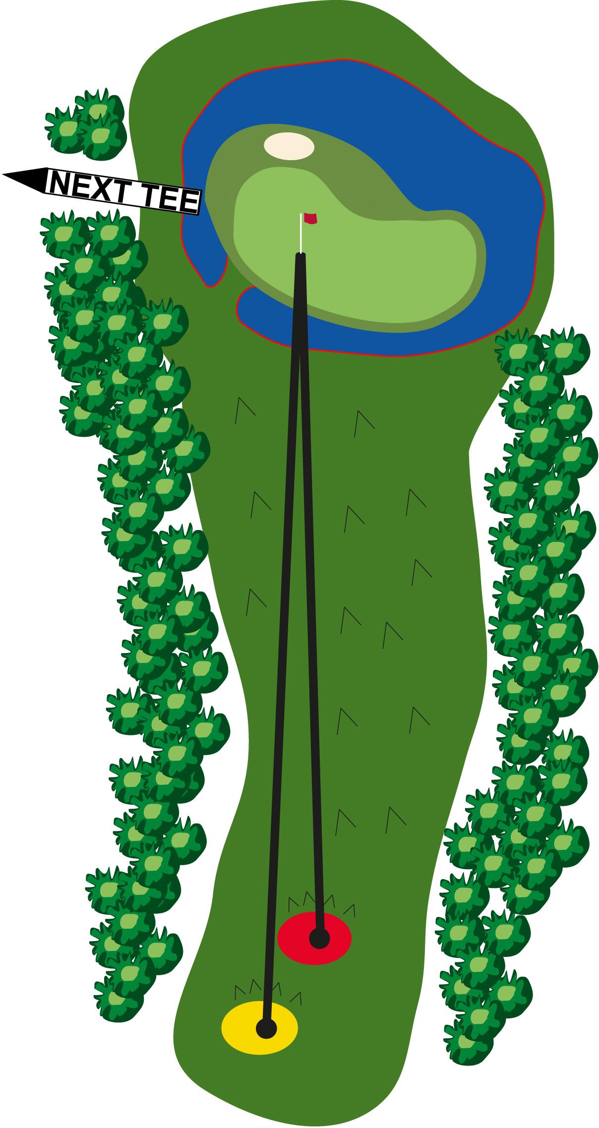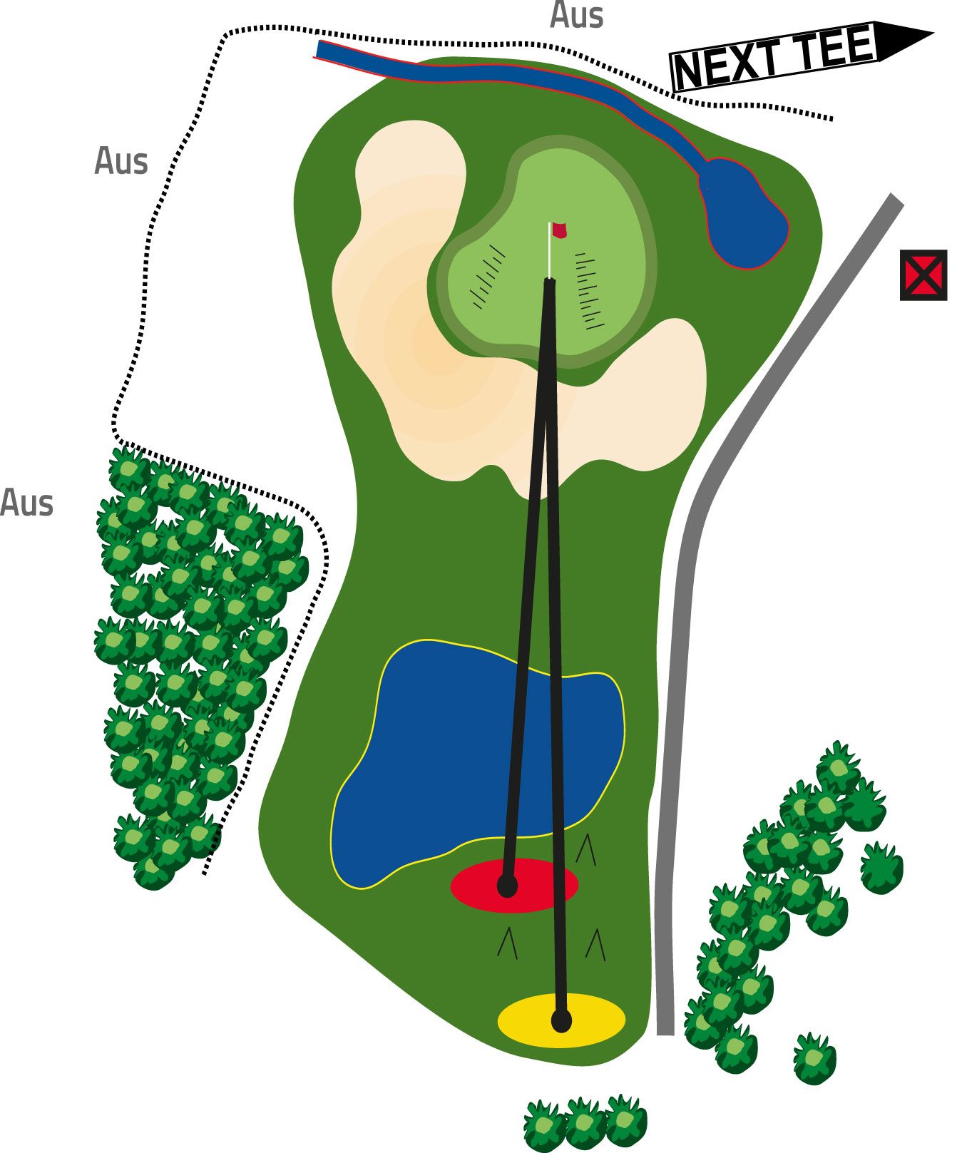 Eine ebenfalls beeindruckende Bahn. Mit einem gezielten, aber langen Drive lässt sich das Wasserhindernis überspielen. "Shorthitter" legen den Ball mit einem langen Eisen oder Holz vor um mit einem zweiten langen Fairwayschlag das Hindernis zu überspielen und das Grün anzugreifen. Das Loch liegt oben vor dem Wald. Ein sehr schwieriges Grün, dass gerne das Par verhindert.