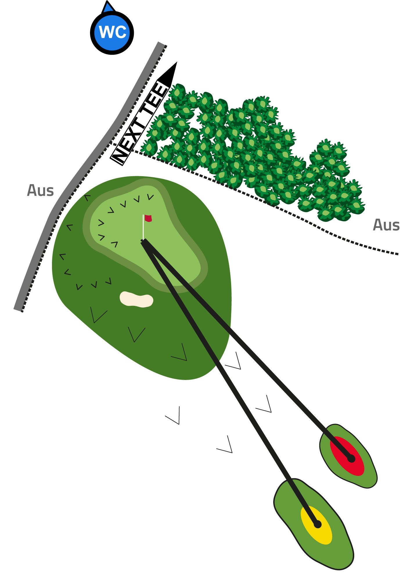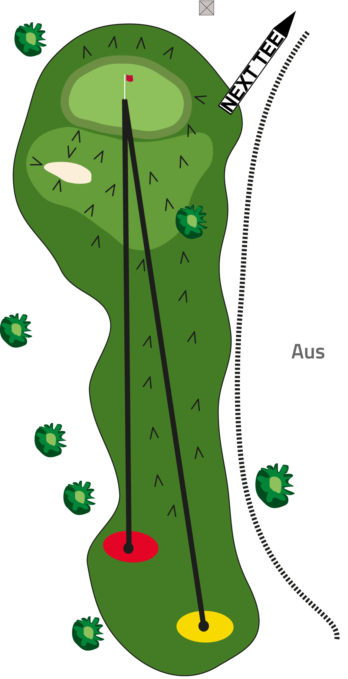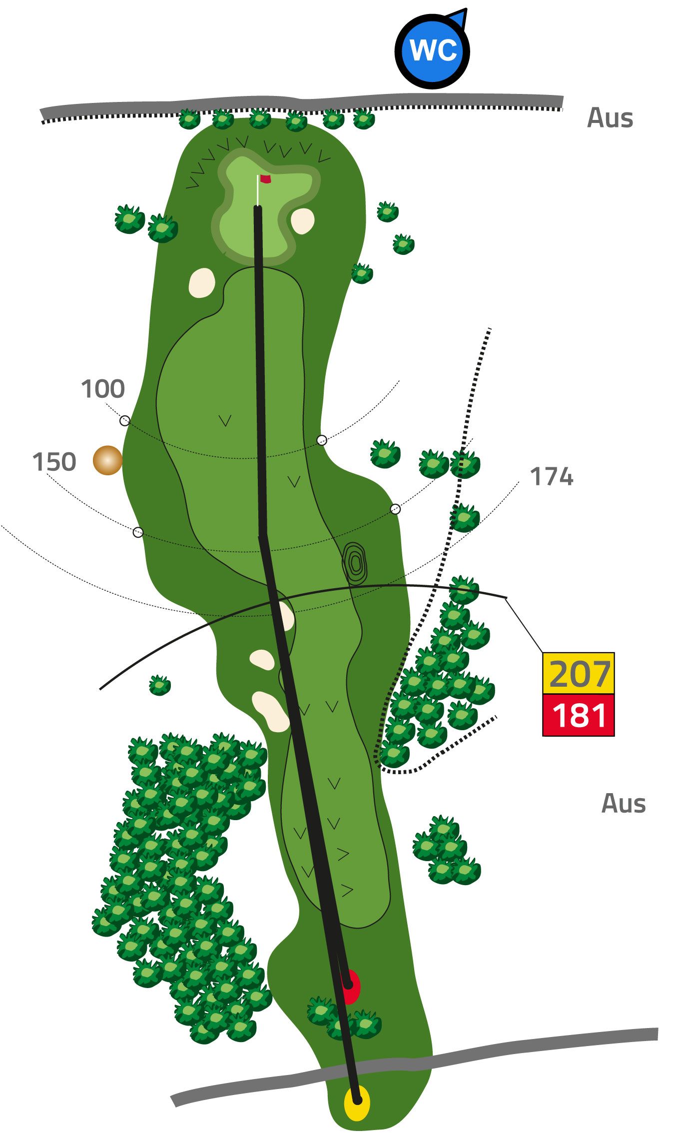 Der Abschlag durch eine Engstelle, bei der sich links und rechts eine Ausgrenze befindet (Achtung Änderung in 10/21: nach dem Weg rechts wurde die Ausgrenze durch eine rote Penalty Area ersetzt), erfordert spielerisches Geschick. Nach einem einfachen zweiten Schlag - beeindruckt von der plötzlichen Fairwaybreite - präsentiert sich ein interessantes Grün.